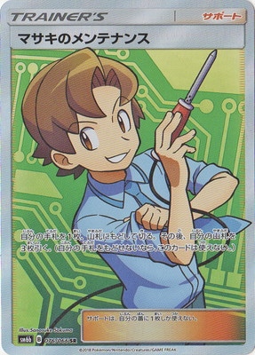 マサキのメンテナンス マサキのメンテナンス SM6b 076 / 066 イラストレーター Sanosuke Sakuma サポート 自分の手札を1枚、山札にもどして切る。その後、自分の山札を3枚引く。(自分の手札をもどせないなら、このカードは使えない。) サポートは、自分の番に1枚しか使えない。