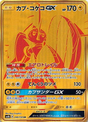 たね HP 170 タイプ 特性 エアロトレイル 自分の番に、このカードを手札からベンチに出したとき、1回使える。自分の場のポケモンについているエネルギーを好きなだけ、このポケモンにつけ替える。つけ替えた場合、このポケモンをバトルポケモンと入れ替える。 ワザ てんくうのツメ130 GXワザ カプサンダーGX50× 相手の場のポケモンについているエネルギーの数×50ダメージ。[対戦中、自分はGXワザを1回しか使えない。] 特別なルール ポケモンGXがきぜつしたとき、相手はサイドを2枚とる。 弱点 抵抗力 にげる -- --
