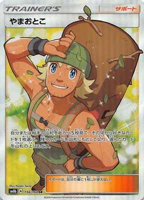 やまおとこ やまおとこ SM8b 156 / 150 イラストレーター Naoki Saito サポート 自分または相手の山札を上から5枚見て、その中から好きなカードを1枚選ぶ。残りのカードを山札にもどして切り、選んだカードを山札の上にもどす。 サポートは、自分の番に1枚しか使えない。