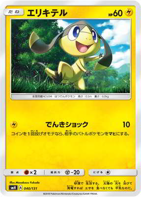 エリキテル エリキテル SMH 040 / 131 No.694 はつでんポケモン 高さ:0.5 m  重さ:6 kg 砂漠で 生活する。 太陽の 光を 浴びて 発電すれば エサを 食べなくても 平気なのだ。 イラストレーター Masakazu Fukuda たね HP 60 タイプ ワザ でんきショック 10 コインを1回投げオモテなら、相手のバトルポケモンをマヒにする。 弱点 抵抗力 にげる ×2 −20 進化 エレザード エリキテル