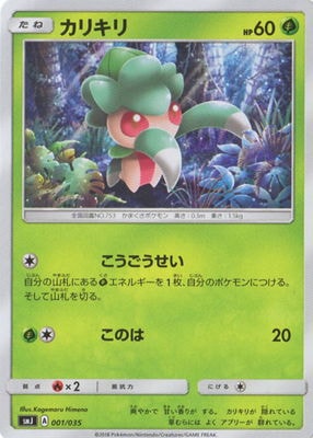 カリキリ カリキリ SMJ 001 / 035 No.753 かまくさポケモン 高さ:0.3 m  重さ:1.5 kg 爽やかで 甘い香りが する。 カリキリが 隠れている 草むらには よく アブリーが 群れている。 イラストレーター Kagemaru Himeno たね HP 60 タイプ ワザ こうごうせい 自分の山札にあるエネルギーを1枚、自分のポケモンにつける。そして山札を切る。 このは 20 弱点 抵抗力 にげる ×2 -- 進化 ラランテスGX ラランテス カリキリ