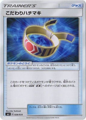 こだわりハチマキ こだわりハチマキ SMJ 026 / 035 イラストレーター Eske Yoshinob ポケモンのどうぐ ポケモンのどうぐは、自分のポケモンにつけて使う。ポケモン1匹につき1枚だけつけられ、つけたままにする。 このカードをつけているポケモンが使うワザの、相手のバトル場のポケモンGX・EXへのダメージは「+30」される。 グッズは、自分の番に何枚でも使える。