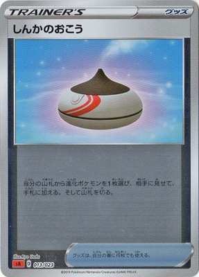 しんかのおこう しんかのおこう SA 013 / 023 イラストレーター Ryo Ueda グッズ 自分の山札から進化ポケモンを1枚選び、相手に見せて、手札に加える。そして山札を切る。 グッズは、自分の番に何枚でも使える。