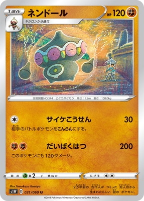 ネンドール ネンドール S1W 031 / 060 No.344 どぐうポケモン 高さ:1.5 m  重さ:108 kg 2万年前の 古代人が つくった 泥人形から 生まれたらしい 謎の ポケモン。 イラストレーター Tomokazu Komiya 1 進化 HP 120 タイプ ワザ サイケこうせん30 相手のバトルポケモンをこんらんにする。 だいばくはつ200 このポケモンにも120ダメージ。 弱点 抵抗力 にげる ×2 -- 進化 ネンドール ヤジロン