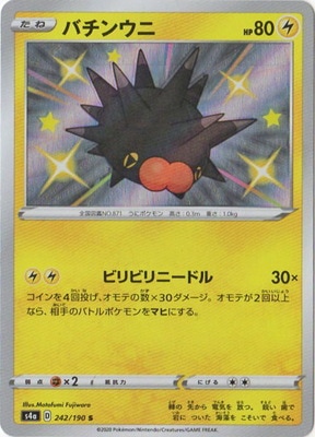 たね HP 80 タイプ ワザ ビリビリニードル30× コインを4回投げ、オモテの数×30ダメージ。オモテが2回以上なら、相手のバトルポケモンをマヒにする。 弱点 抵抗力 にげる ×2 --