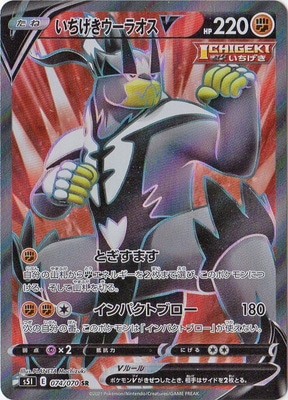 たね HP 220 タイプ ワザ とぎすます 自分の山札からエネルギーを2枚まで選び、このポケモンにつける。そして山札を切る。 インパクトブロー180 次の自分の番、このポケモンは「インパクトブロー」が使えない。 特別なルール ポケモンVがきぜつしたとき、相手はサイドを2枚とる。 弱点 抵抗力 にげる ×2 -- 進化 いちげきウーラオスVMAX いちげきウーラオスV