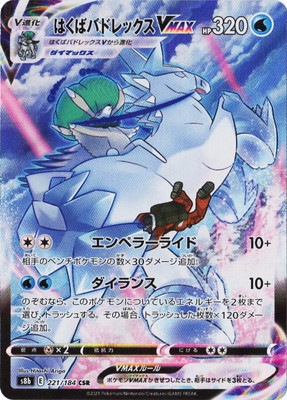 VMAX HP 320 タイプ ワザ エンペラーライド10+ 相手のベンチポケモンの数×30ダメージ追加。 ダイランス10+ のぞむなら、このポケモンについているエネルギーを2枚まで選び、トラッシュする。その場合、トラッシュした枚数×120ダメージ追加。 特別なルール ポケモンVMAXがきぜつしたとき、相手はサイドを3枚とる。 弱点 抵抗力 にげる ×2 -- 進化 はくばバドレックスVMAX はくばバドレックスV
