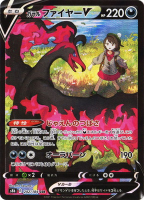 たね HP 220 タイプ 特性 じゃえんのつばさ 自分の番に1回使える。自分のトラッシュからエネルギーを1枚選び、このポケモンにつける。この番、すでに別の「じゃえんのつばさ」を使っていたなら、この特性は使えない。 ワザ オーラバーン190 このポケモンにも30ダメージ。 特別なルール ポケモンVがきぜつしたとき、相手はサイドを2枚とる。 弱点 抵抗力 にげる ×2 --