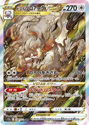 V進化 HP 270 タイプ ワザ のろいをきざむ50× 自分の場のダメカンがのっているポケモンの数×50ダメージ。 VSTARパワー 特性 ファントムスター 自分の番に使える。自分の手札をすべてトラッシュし、山札を7枚引く。[対戦中、自分はVSTARパワーを1回しか使えない。] 特別なルール ポケモンVSTARがきぜつしたとき、相手はサイドを2枚とる。 弱点 抵抗力 にげる ×2 -- 進化 ヒスイ ゾロアークVSTAR ヒスイ ゾロアークV