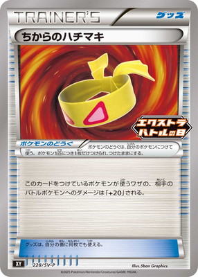 ちからのハチマキ ちからのハチマキ SV-P 228 / SV-P イラストレーター 5ban Graphics ポケモンのどうぐ このカードをつけているポケモンが使うワザの、相手のバトルポケモンへのダメージは「+20」される。 ポケモンのどうぐは、自分の番に何枚でも、自分のポケモンにつけられる。ポケモン1匹につき1枚だけつけられ、つけたままにする。