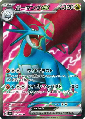 2 進化 HP 320 タイプ ワザ ワイドブラスト 相手のベンチポケモン全員に、それぞれ50ダメージ。[ベンチは弱点・抵抗力を計算しない。] ドラゴンインパクト300 このポケモンについているエネルギーを2個選び、トラッシュする。 特別なルール ポケモンexがきぜつしたとき、相手はサイドを2枚とる。 弱点 抵抗力 にげる -- -- 進化 ボーマンダGX ボーマンダ ボーマンダex コモルー タツベイ